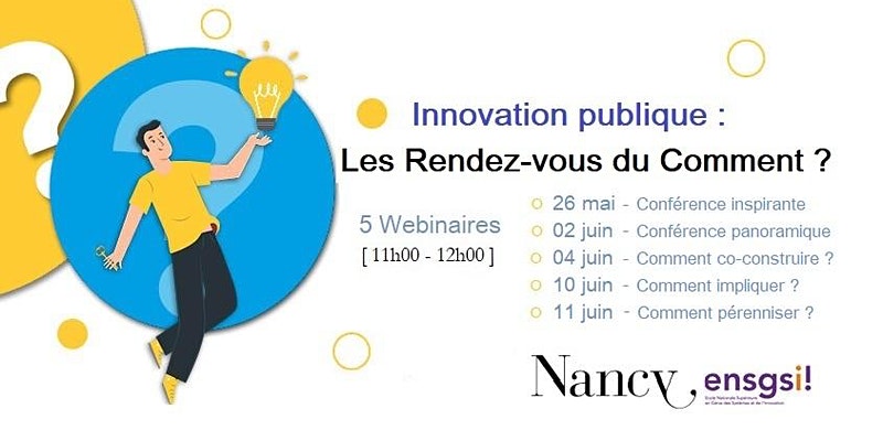 La Ville de Nancy et l’ENSGSI (Ecole Nationale SupĂ©rieure en GĂ©nie des SystĂšmes et de l’Innovation) proposent aux agents de la fonction publique, 2 rendez-vous Ă distance dâune heure chacun pour partager avec des organisations qui ont fait le pari de l’innovation.